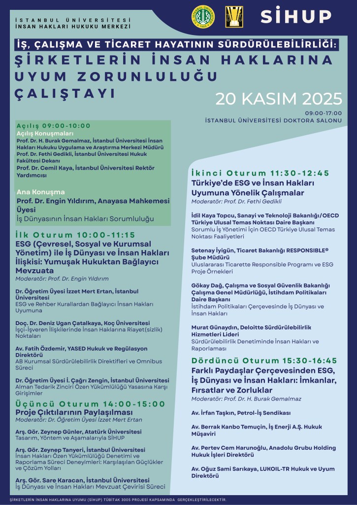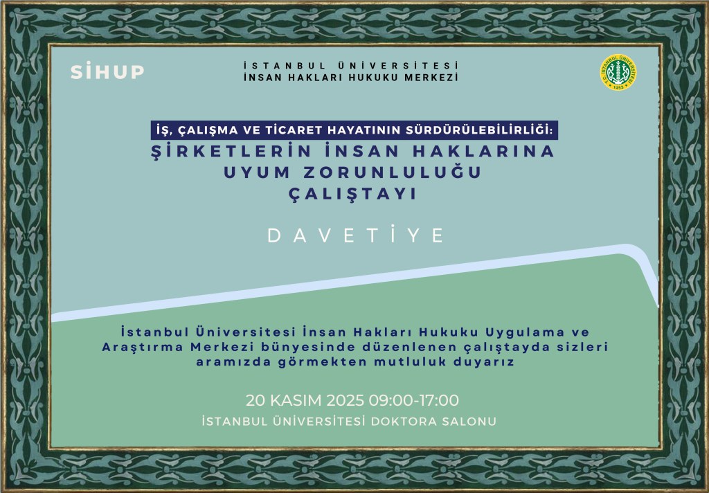 İstanbul Üniversitesi İnsan Hakları Hukuku Uygulama ve Araştırma Merkezi bünyesinde yürütülen Şirketlerin İnsan Haklarına Uyumu (SİHUP) TÜBİTAK Projesi kapsamında 20 Kasım 2025 tarihinde “İş, Çalışma ve Ticaret Hayatının Sürdürülebilirliği: Şirketlerin İnsan Haklarına Uyum Zorunluluğu Çalıştayı” düzenlenecektir.